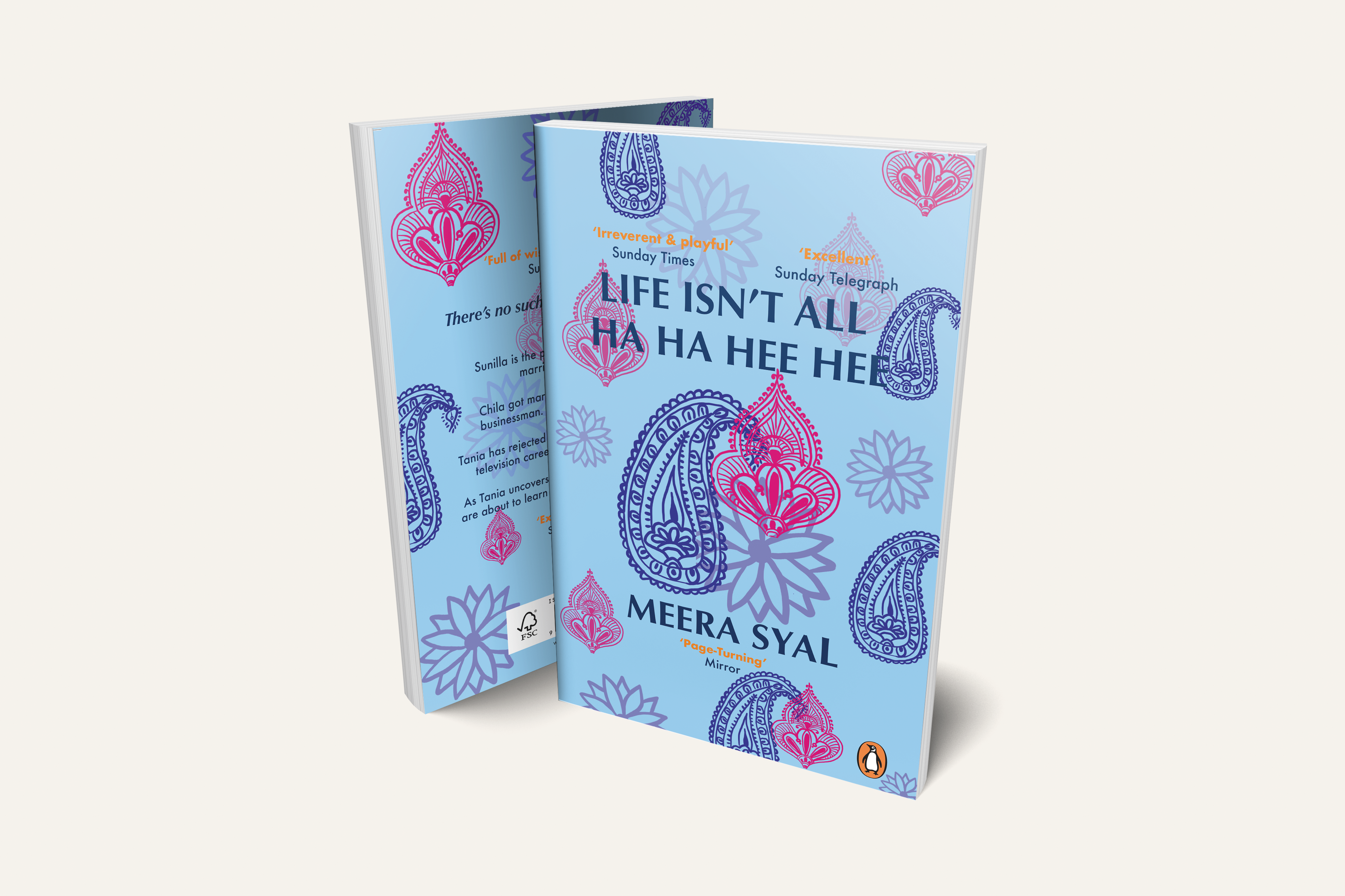 A bright, modernised book cover using patterns inspired by the Punjabi heritage of the three main characters. Each pattern represents one of the characters; the overlapping of the shapes illustrates the conflicts and changing relationships between the women.